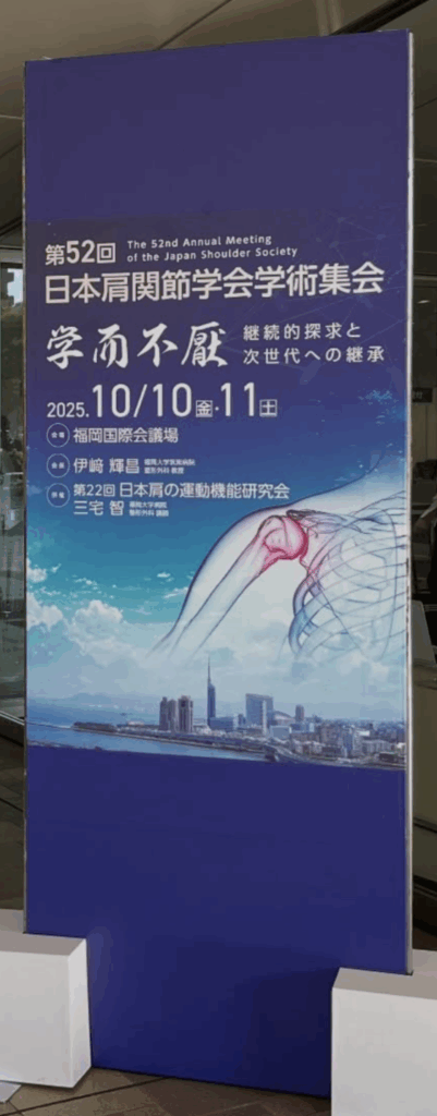 2025年10⽉10⽇・10⽉11⽇に福岡国際会議場で開催された第52 回⽇本肩関節学会に参加してきました。凍結肩(五⼗肩)、腱板断裂、不安定症など、肩のエキスパートが⽇本のみでなく海外からも集まり、活発な議論が⾏われていました。⾮常に有意義な時間となり今後の臨床に役⽴つ知識が増えました。是⾮来年も参加したいです!